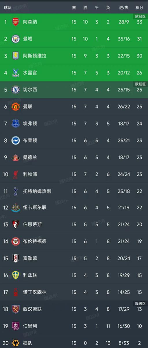 北京時(shí)間12月9日,英超第15輪結(jié)束了所有比賽,最新積分榜如下!